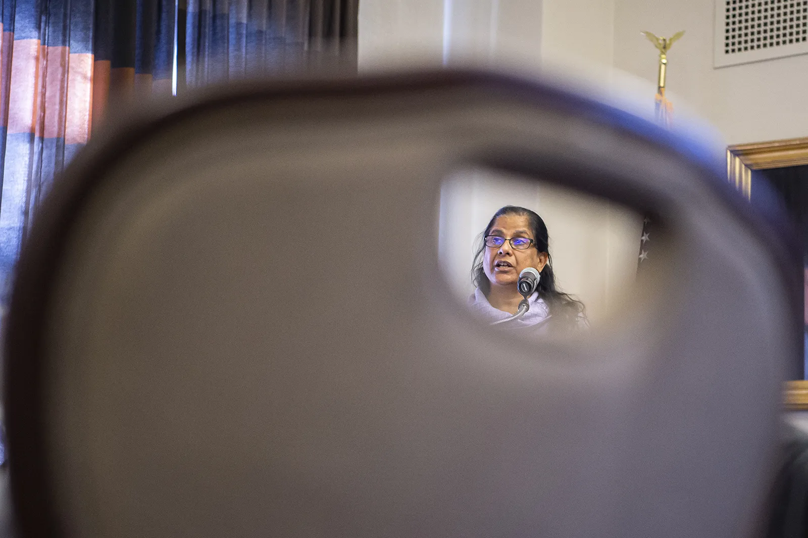 Director Mangala Subramaniam, speaks to a crowd at a Provost Office luncheon.