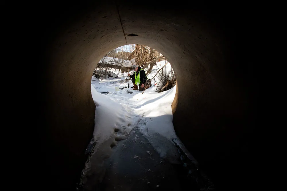 Researcher Max Brubaker takes a water sample from a culvert and creek to test for road salt. He and a graduate student are trying to determine the levels of salt used to de-ice road and their effect on the water quality and habitat.