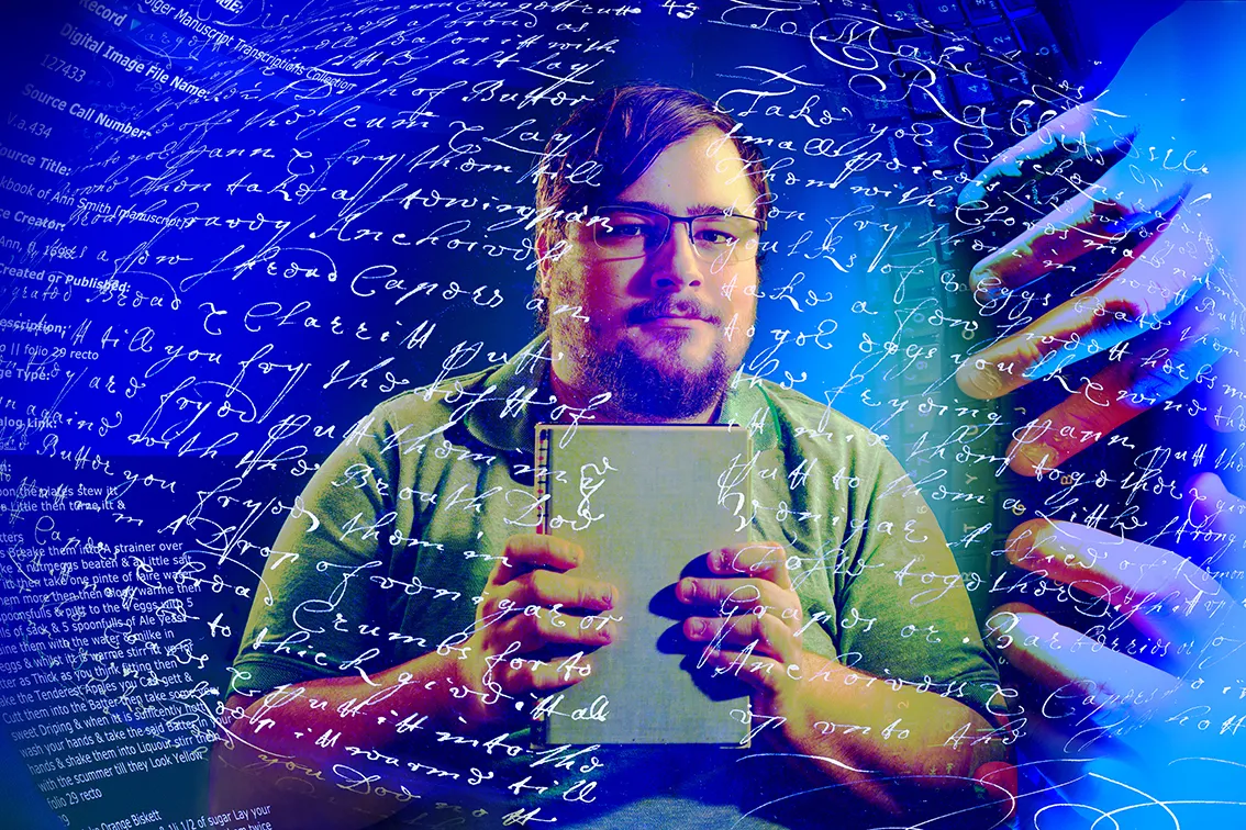 Photo Illustration of undergraduate poetry student, Shaun Nowicki, who works with adding metadata to classic and historic texts to increase their use.