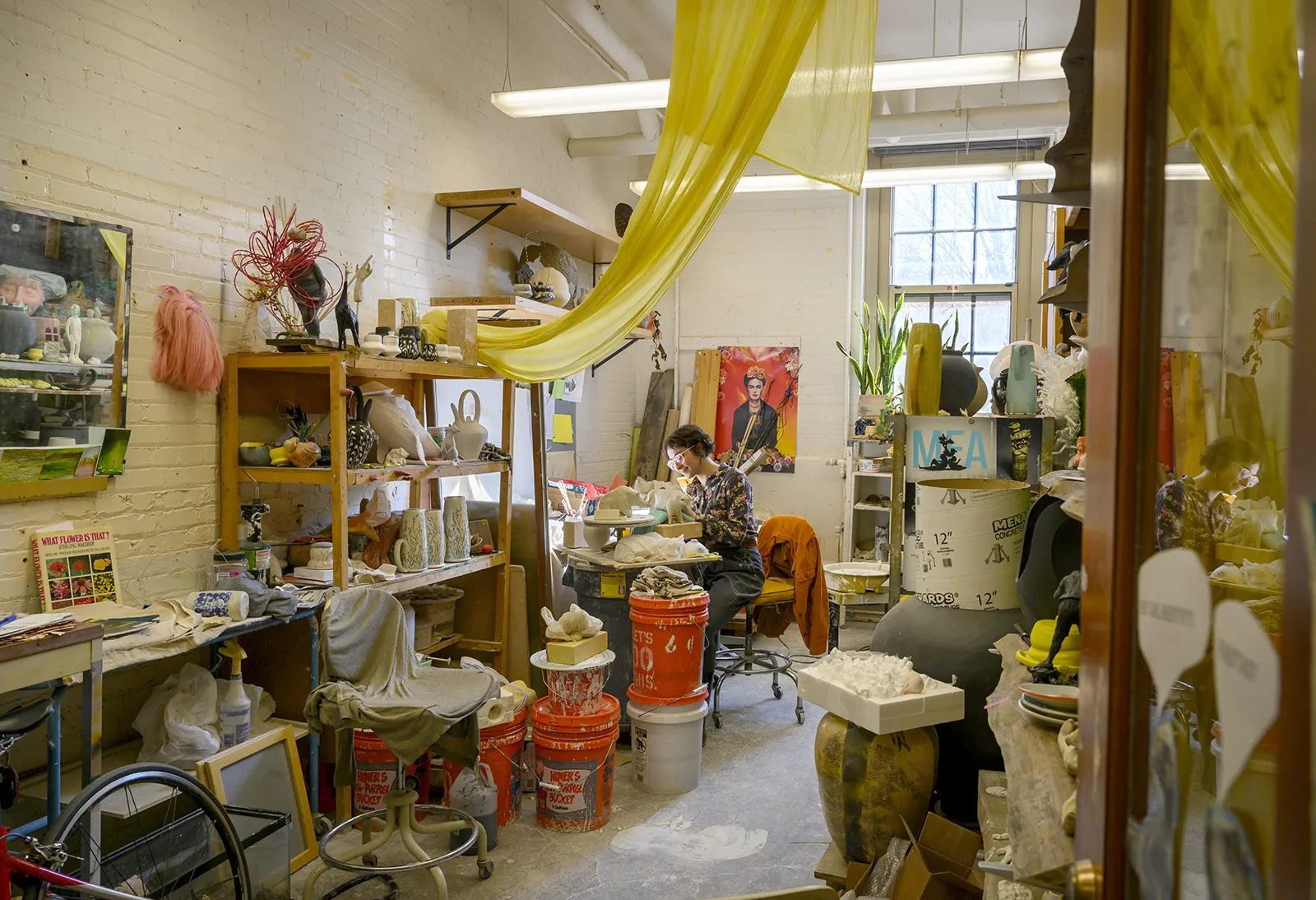 Master of Fine Arts in ceramics Jennifer Kaplan works on a sculpture of a cow in her studio at Riley Hall.