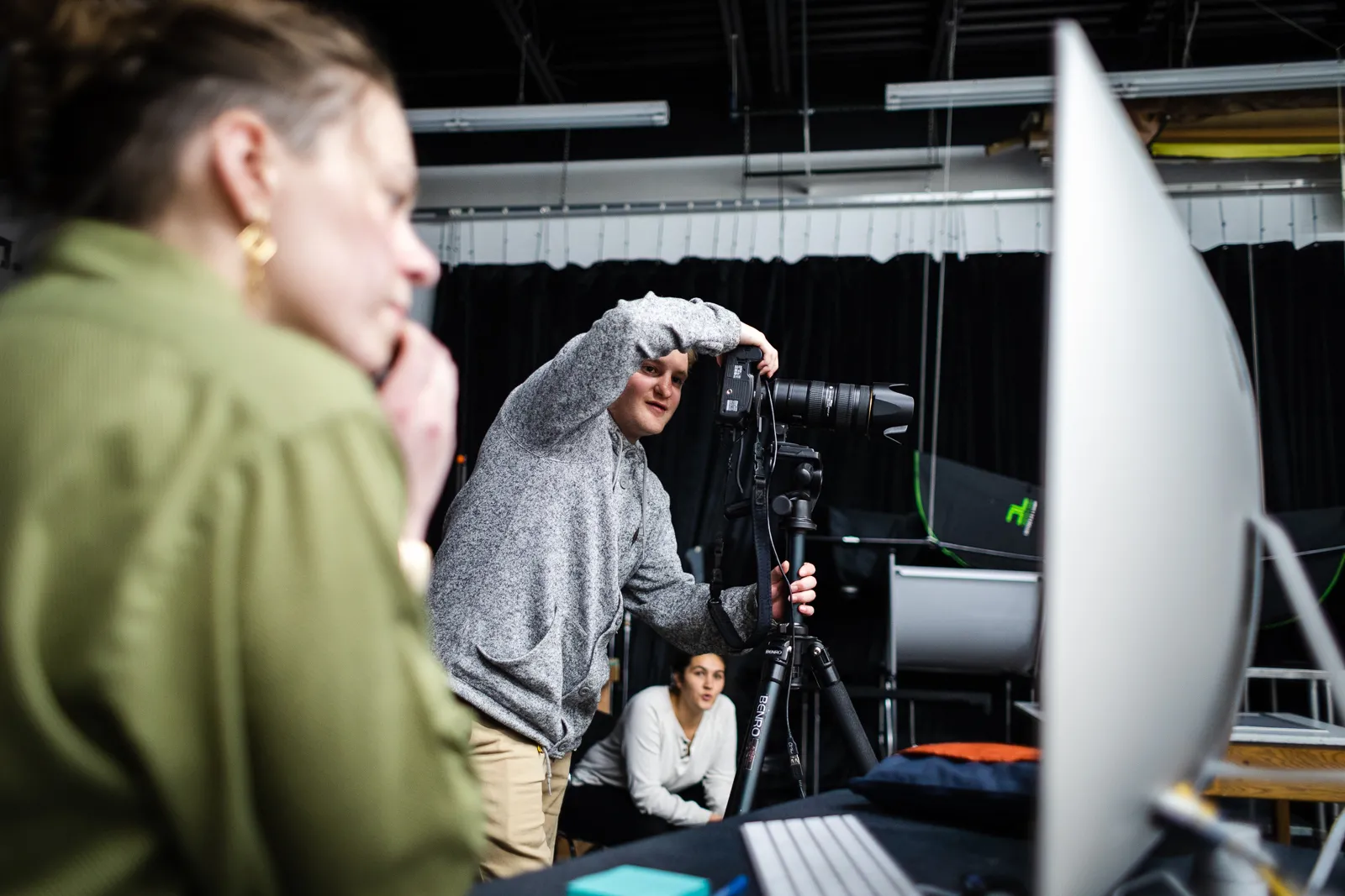 Professional Photography students practice lighting for headshots and using a tethered workflow to immediately review and process shots.