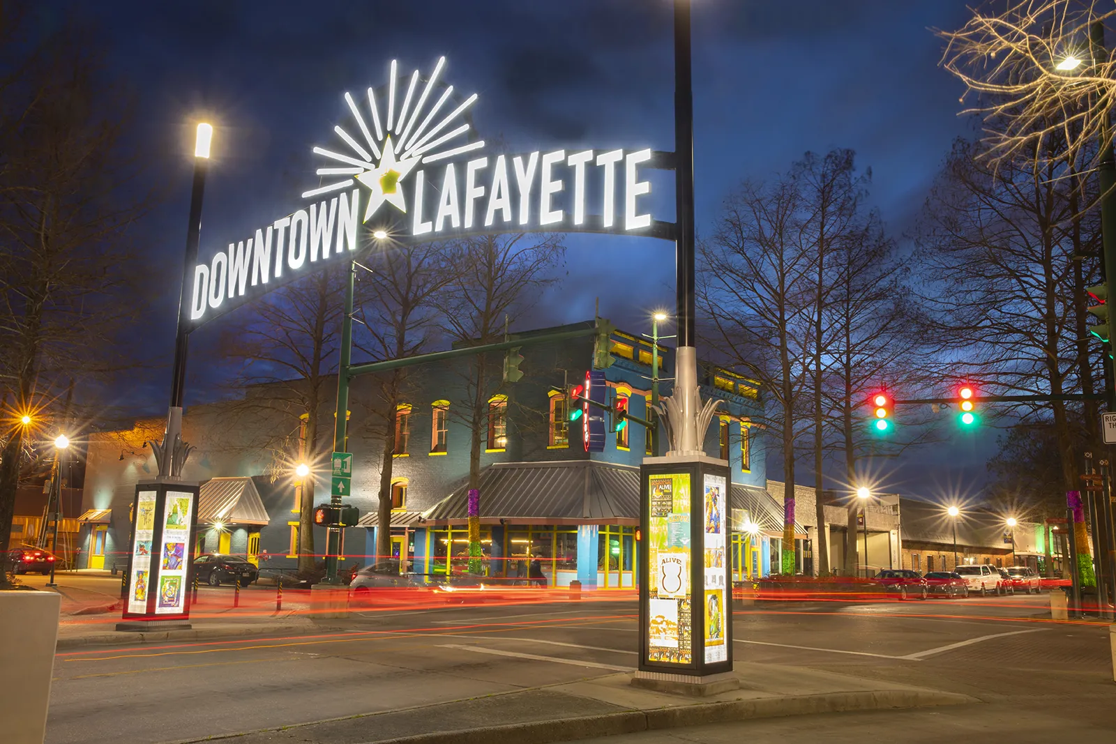Evening photo of the cities gateway to Cajun Country, great food, music and people.