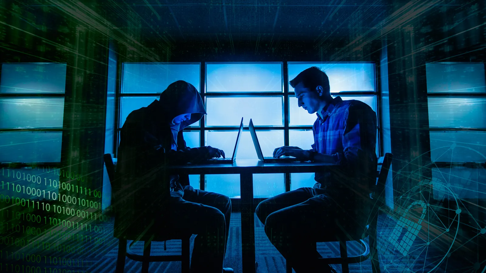 Illustration of a battle between a black-hat hacker and a white-hat hacker for a promo for an upcoming program in Cyber Security.