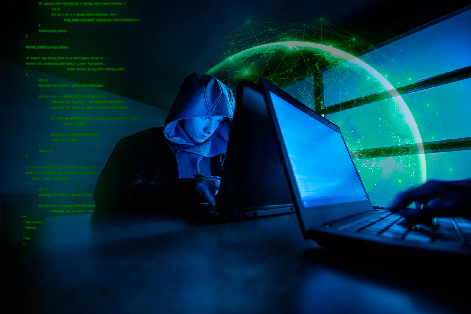 Illustration of a hacker cracking into the world wide web for a promo for the upcoming Cyber Security program.