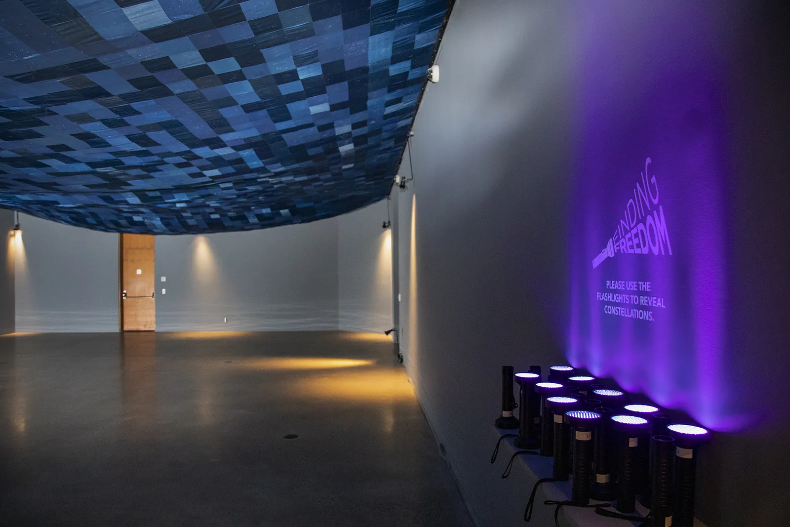 Unfortunately for me, the purpose of the piece is to represent the constellations of a night sky, using blacklight flashlights to illuminate the "stars" on a patchwork quilt hanging from the ceiling of an otherwise dark and empty room.