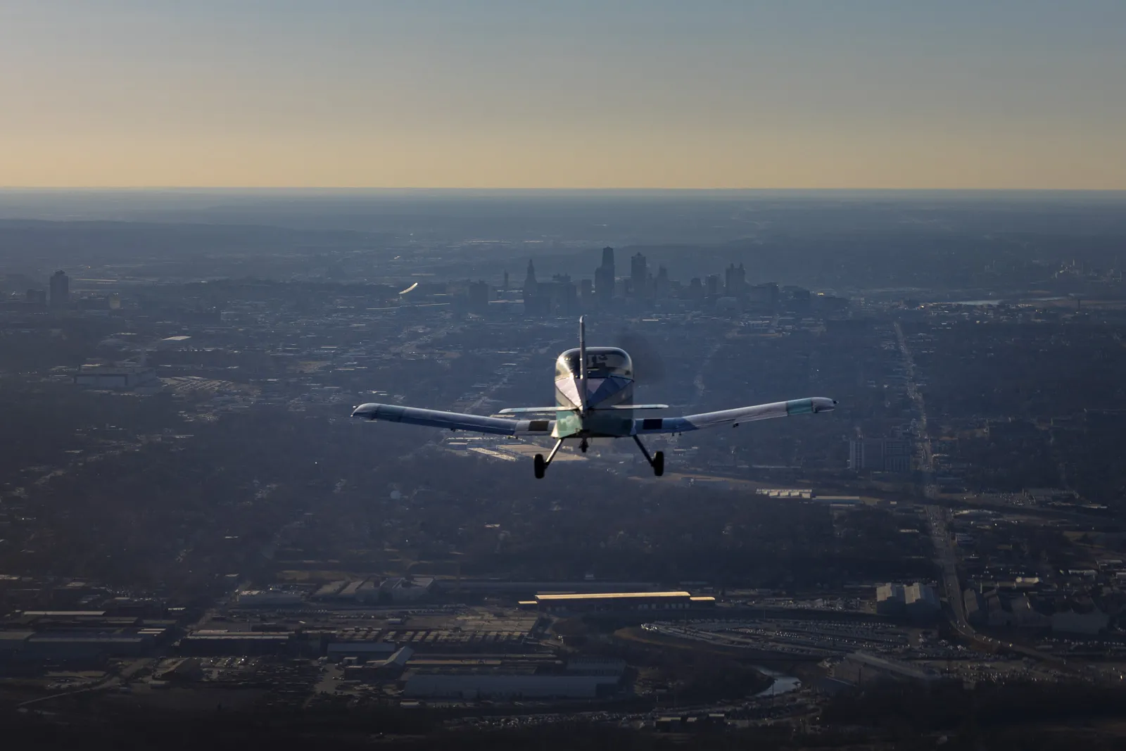 A faculty member flies an airplane toward Kansas City for an article about flight research.