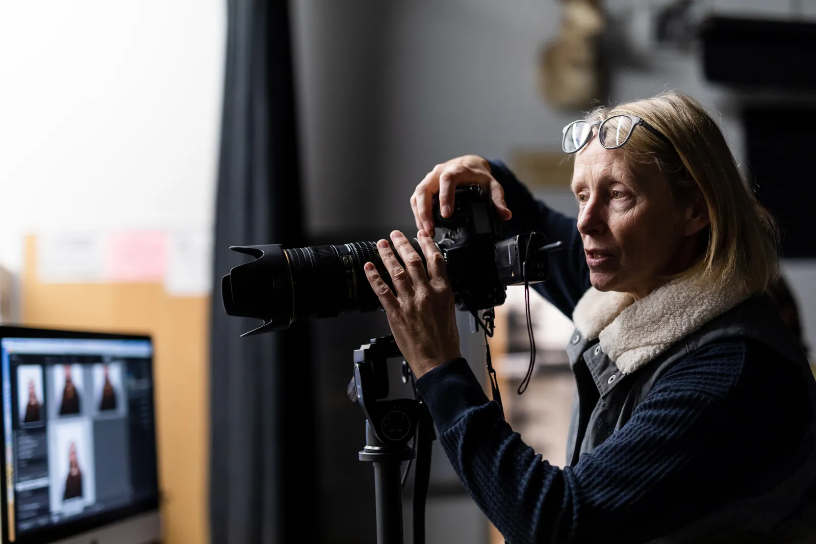 Deb Shannan, a Professional Photography student, provides direction to a theater major posing for their headshot in the photography studio at Colorado Mountain College Spring Valley.