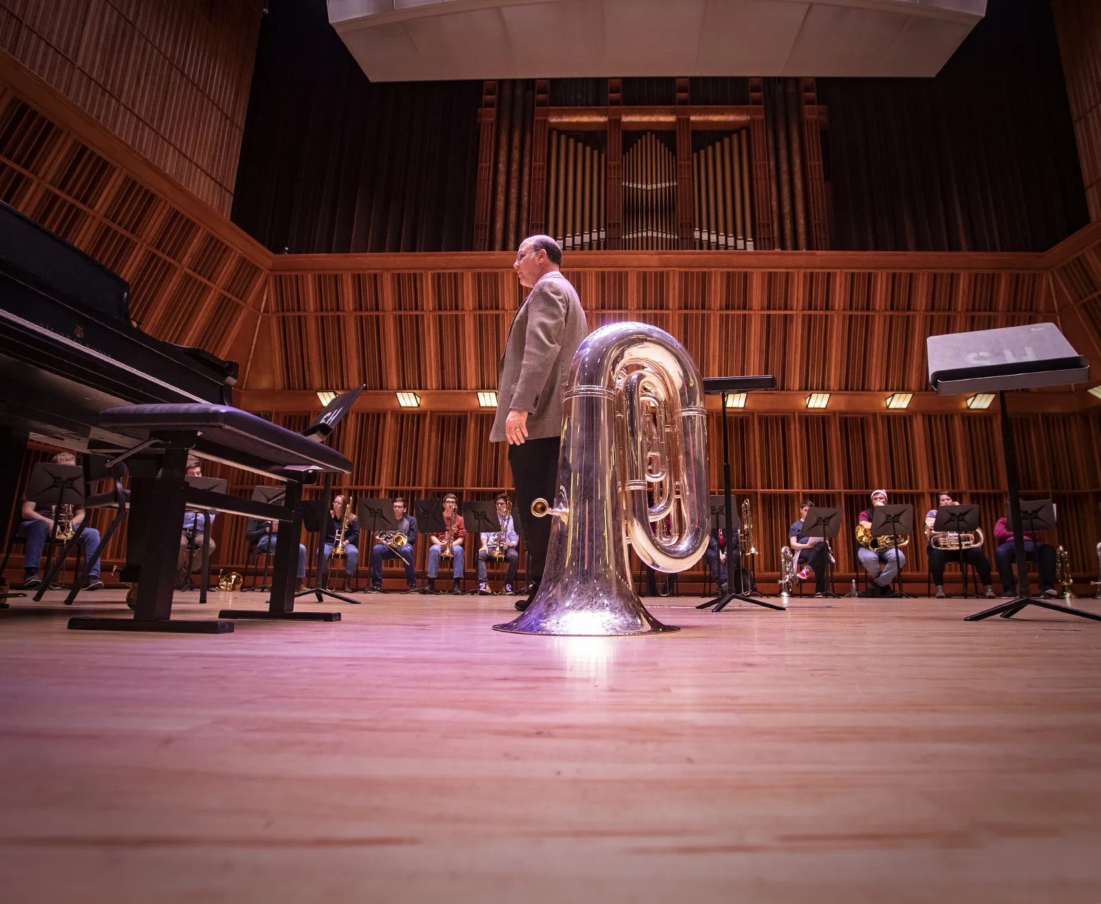 The tuba section of the Symphony gathered with a visiting instructor for some instruction.