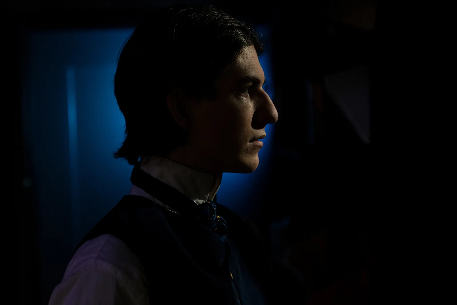 During the dress rehearsal of the current theater production, the antagonist awaits his cue to enter the stage.