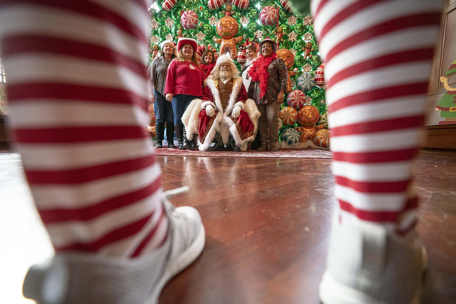 Employee celebration event for the holidays in E. Bronson Ingram College Dining Hall. Employees have their picture taken by one of Santa's elves.