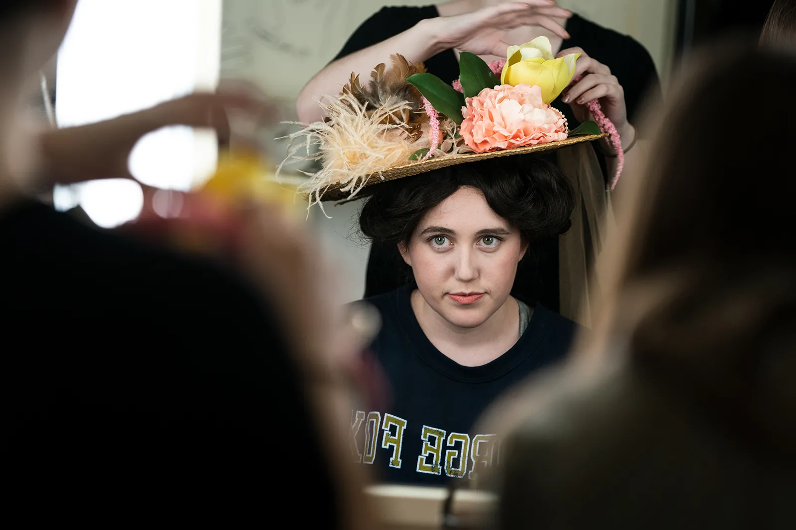 A student is assisted with her costume during a hair and make up session for a dress rehearsal of the current theater production.