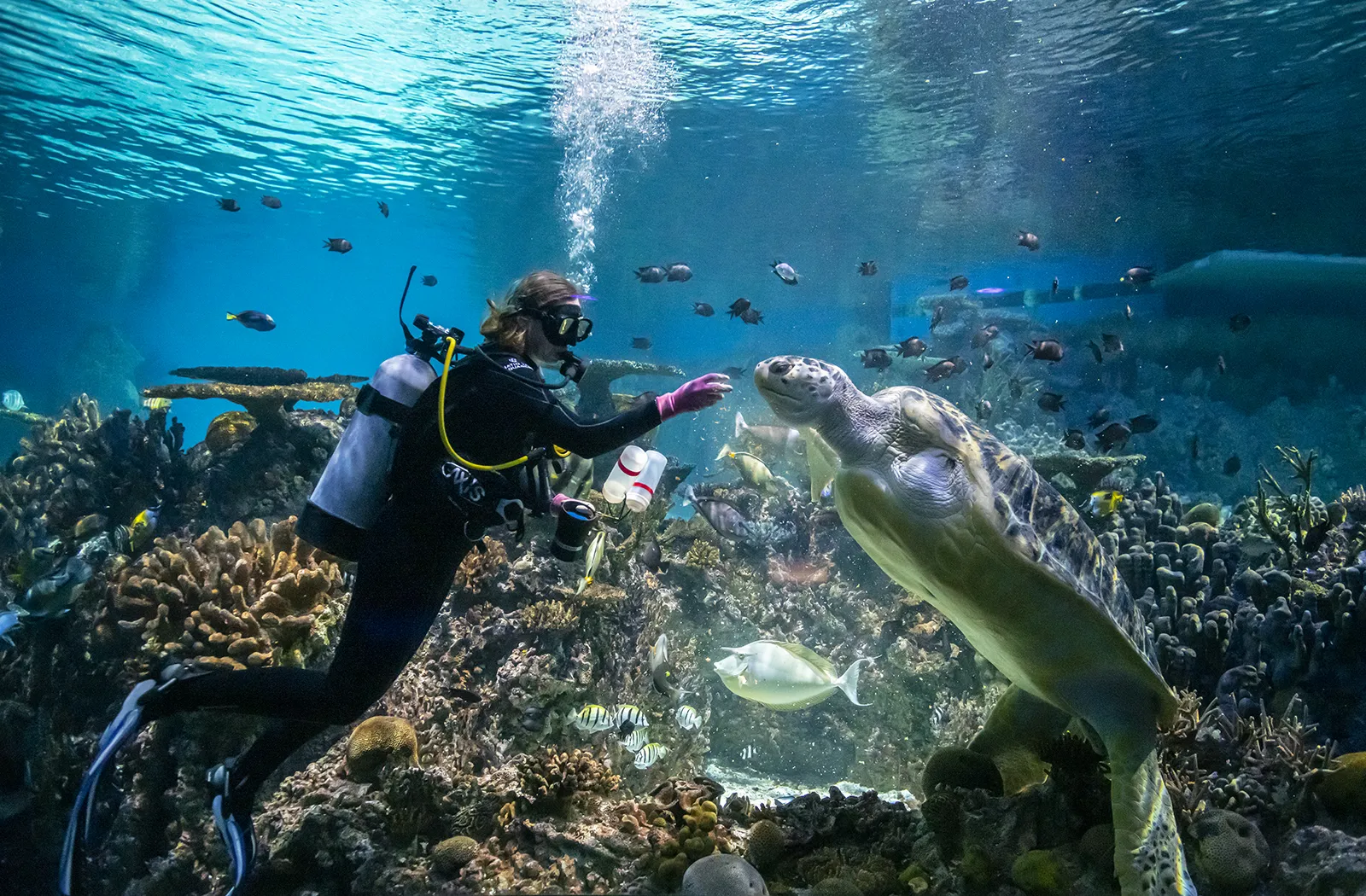 Diver at Baltimore National Aquarium feeding Calypso the turtle.