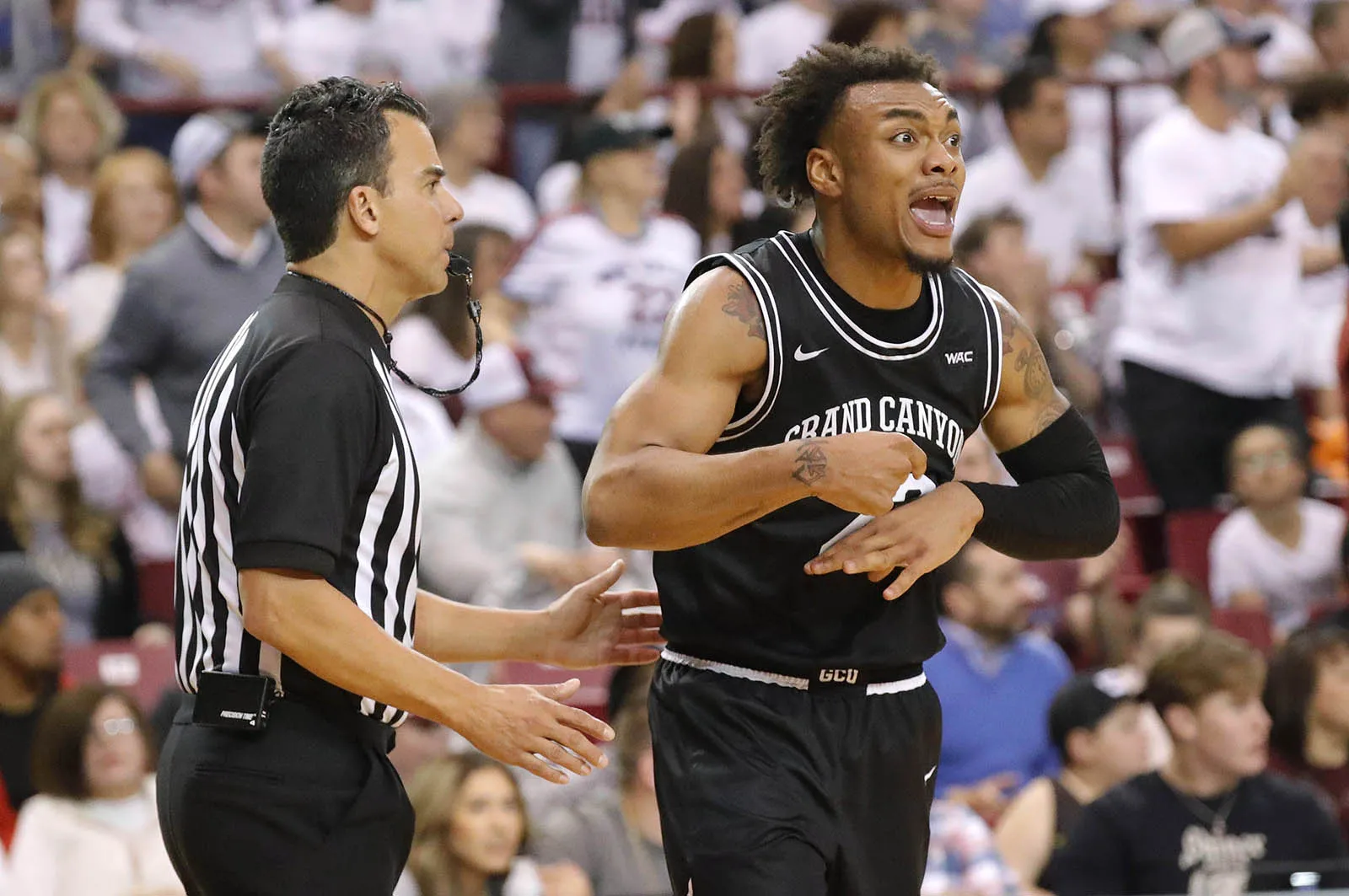 GCU's Carlos Johnson reacts after dislocating his finger against New Mexico State.