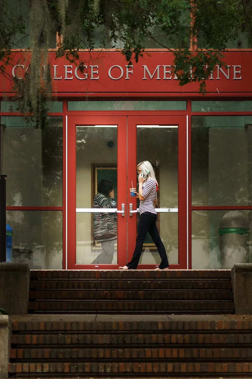 Two people pass by the front of the College of Medicine building on their cellphones.