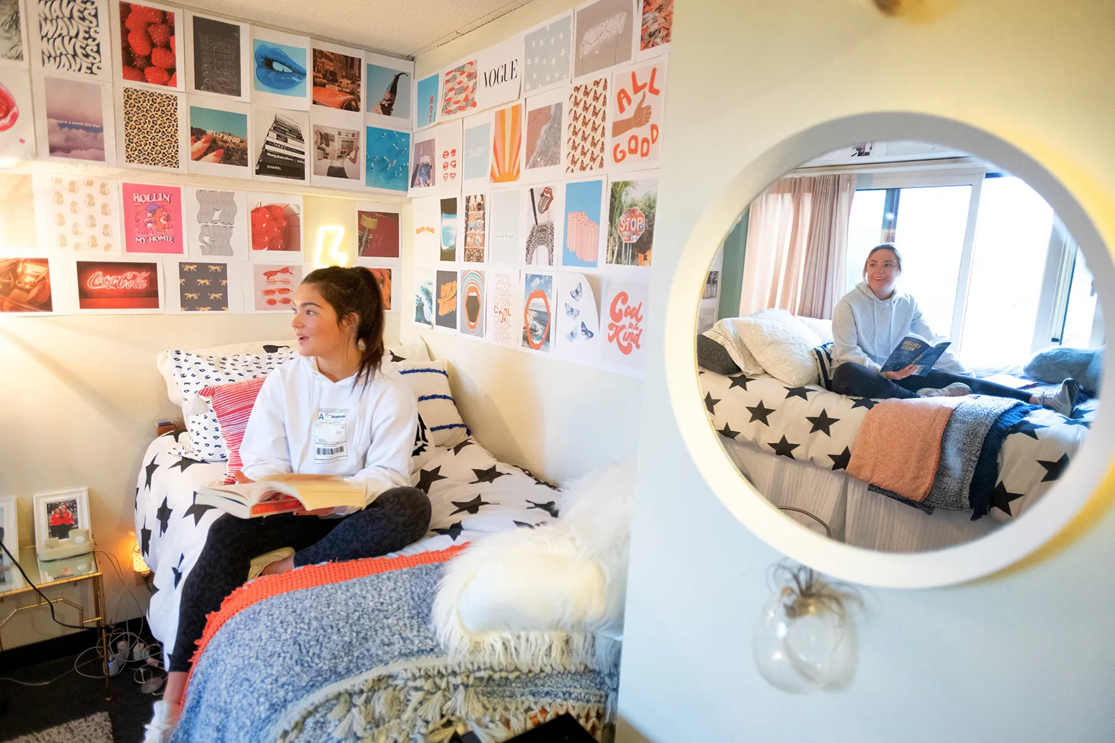 Roommates Halle and Chloe hang out in their room in Mayflower Residence Hall