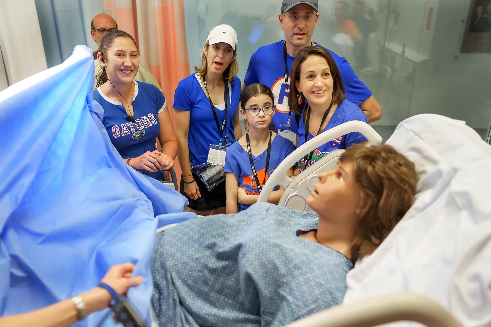Visitors to the simulation lab during homecoming nursing weekend look on as a pregnant simulation doll goes into labor.