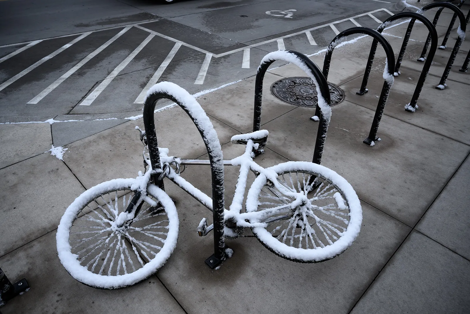 With temperatures hovering right around freezing, the snow only stuck to things, like this bike, that did not retain any heat.