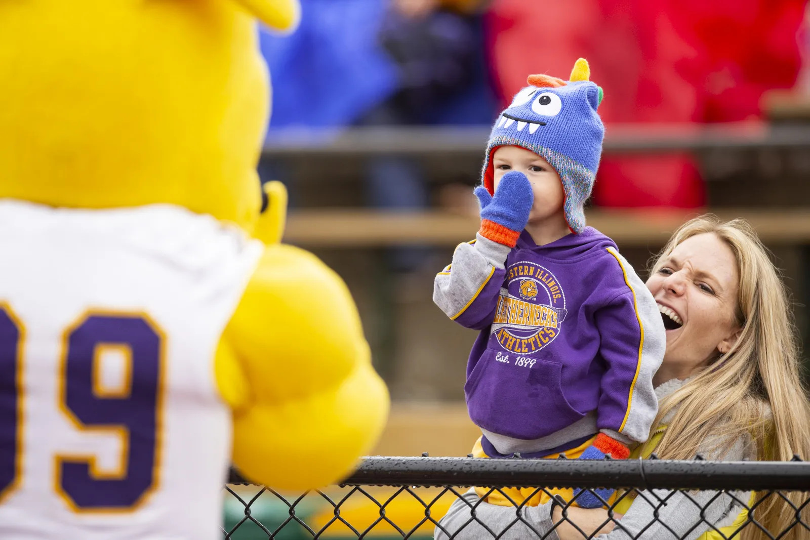 A young leatherneck fan blows kisses to the rocky mascot at a home football game.