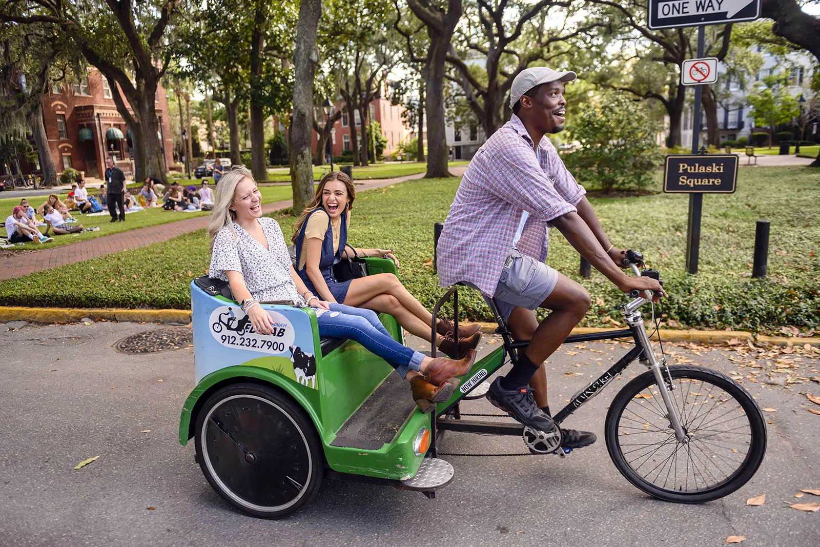 Sara and Rachel enjoy a pedicab ride through downtown Savannah while shooting a tv commercial for the university.