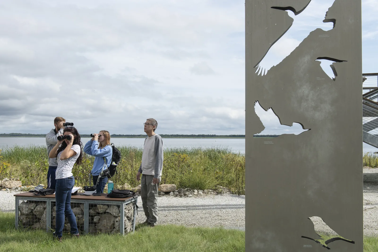 Students in Dr. Dennis Ruez's environmental studies class look for bird species to identify while on a field trip to Emiquon Nature Preserve.