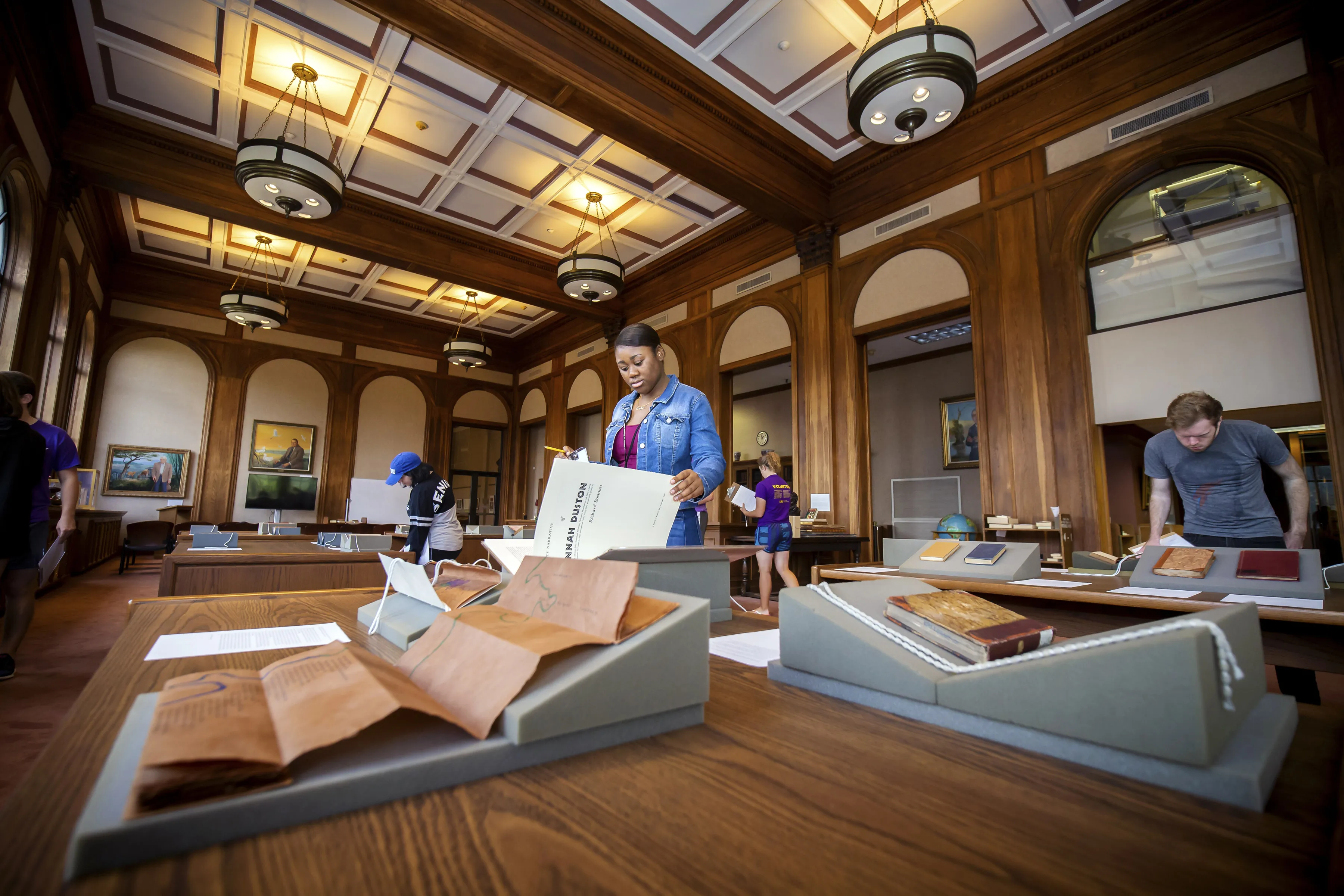 Students in an American Literature class examine antique books in the special collections of Hill Memorial Library.