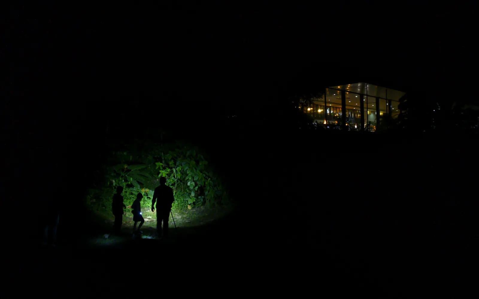 Costa Rican naturalist and guide Erick Castro leads members of a science-centric Rainforest Camp on a night hike to observe rainforest biodiversity by flashlight at the Selva Verde Lodge in Chilamate, Costa Rica. The camp was created in partnership with UF's Florida Museum of Natural History and was led by two Museum experts and two local guides to inspire families to become mindful stewards of biodiversity and conservation.