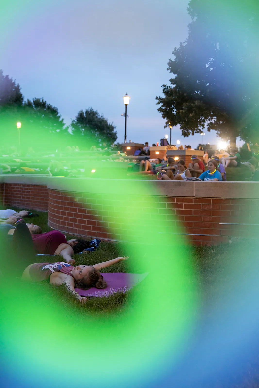 Corinne Baum, a Journalism major from Fairfax, Va., participates in glow yoga on the Traditions Plaza during Welcome Week on Thursday Aug. 15, 2019.