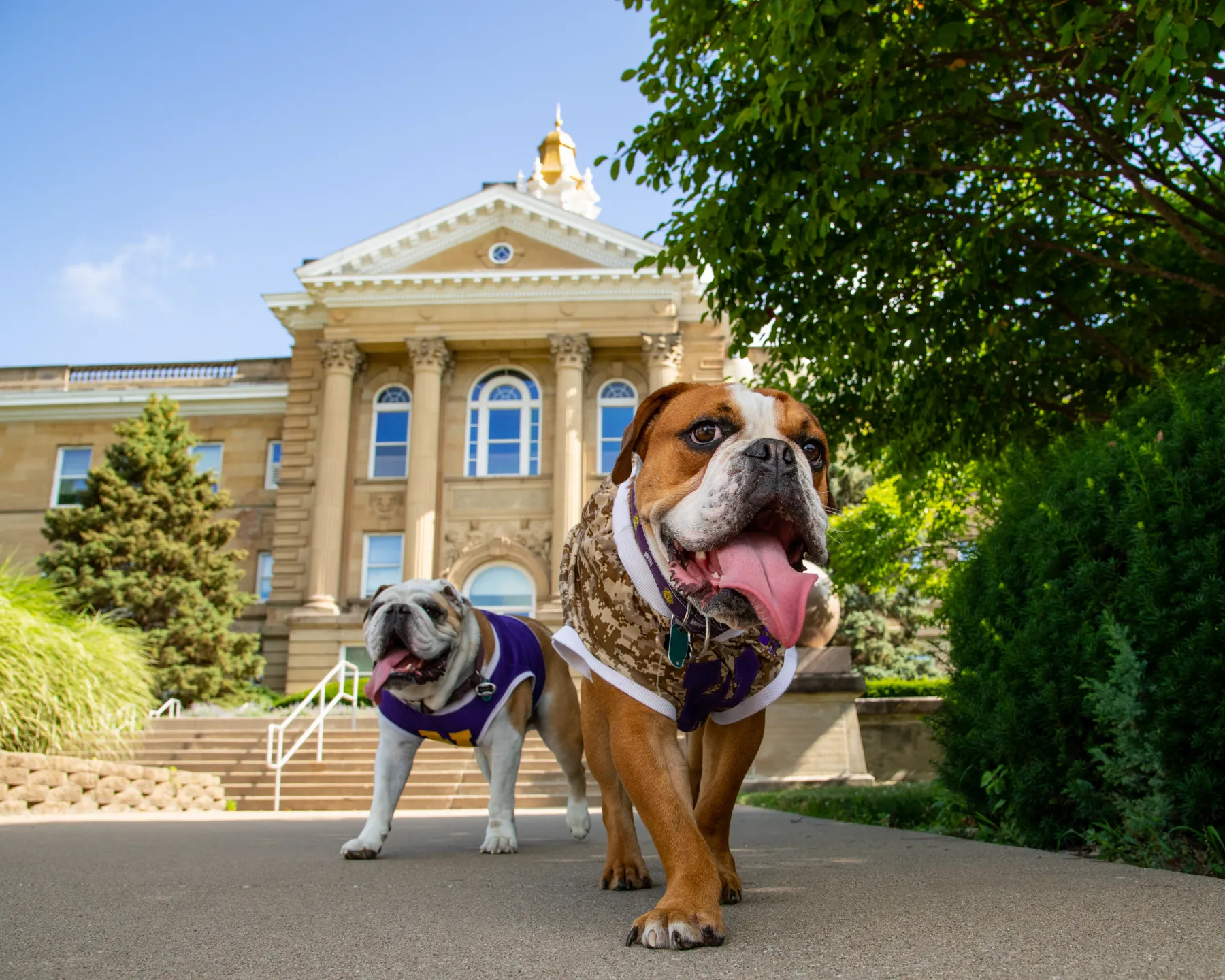 This shot shows our two live mascots walking from our main building, Sherman Hall. Colonel Rock III and IV's names are Rocky and Ray, respectively. Ray is taking the lead in this shot and Rocky is following behind as he is recently retired.