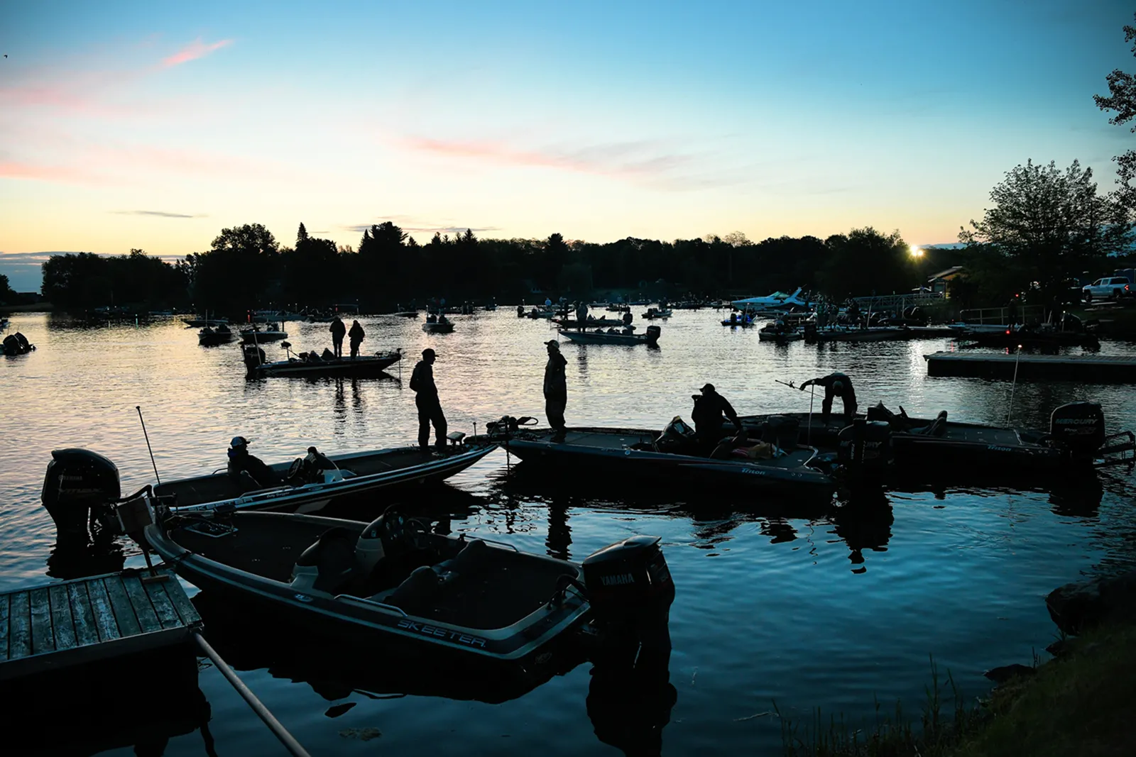 College students from around the United States gather on the St Lawrence River ,during sunrise, to start a national fishing tournament sponsored by Clarkson University in August, 2019.