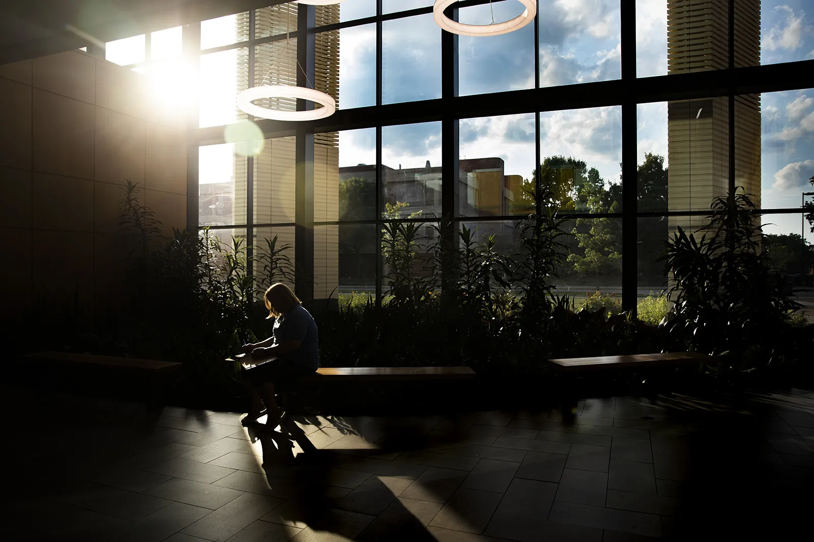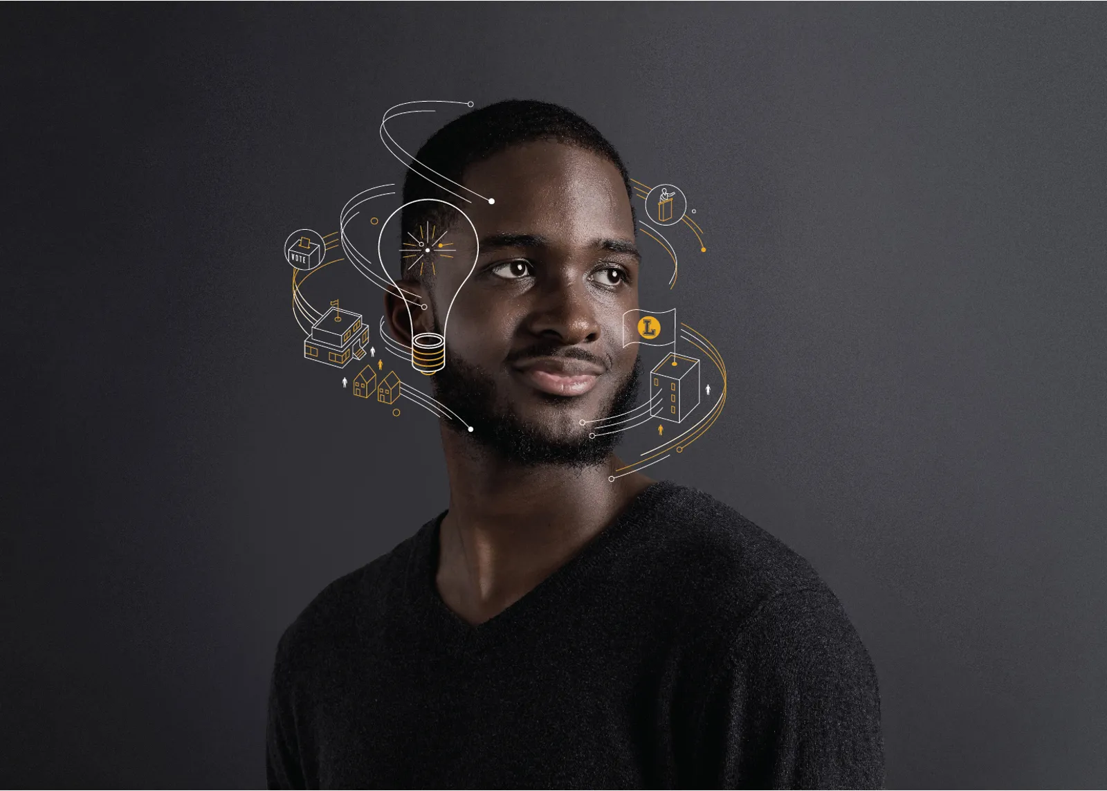 Portrait of Loyola University Chicago alumnus Trevaughn Latimer, who is featured as part of Loyola's new city-wide advertising campaign. The custom-made illustration overlaid on each portrait in the series relates to the subjects field of study or research. In Latimer's case, he is working in St. Louis at the Economic Development Partnership—an Obama-era initiative that targets urban areas with high crime, poverty and lack of local leaders.