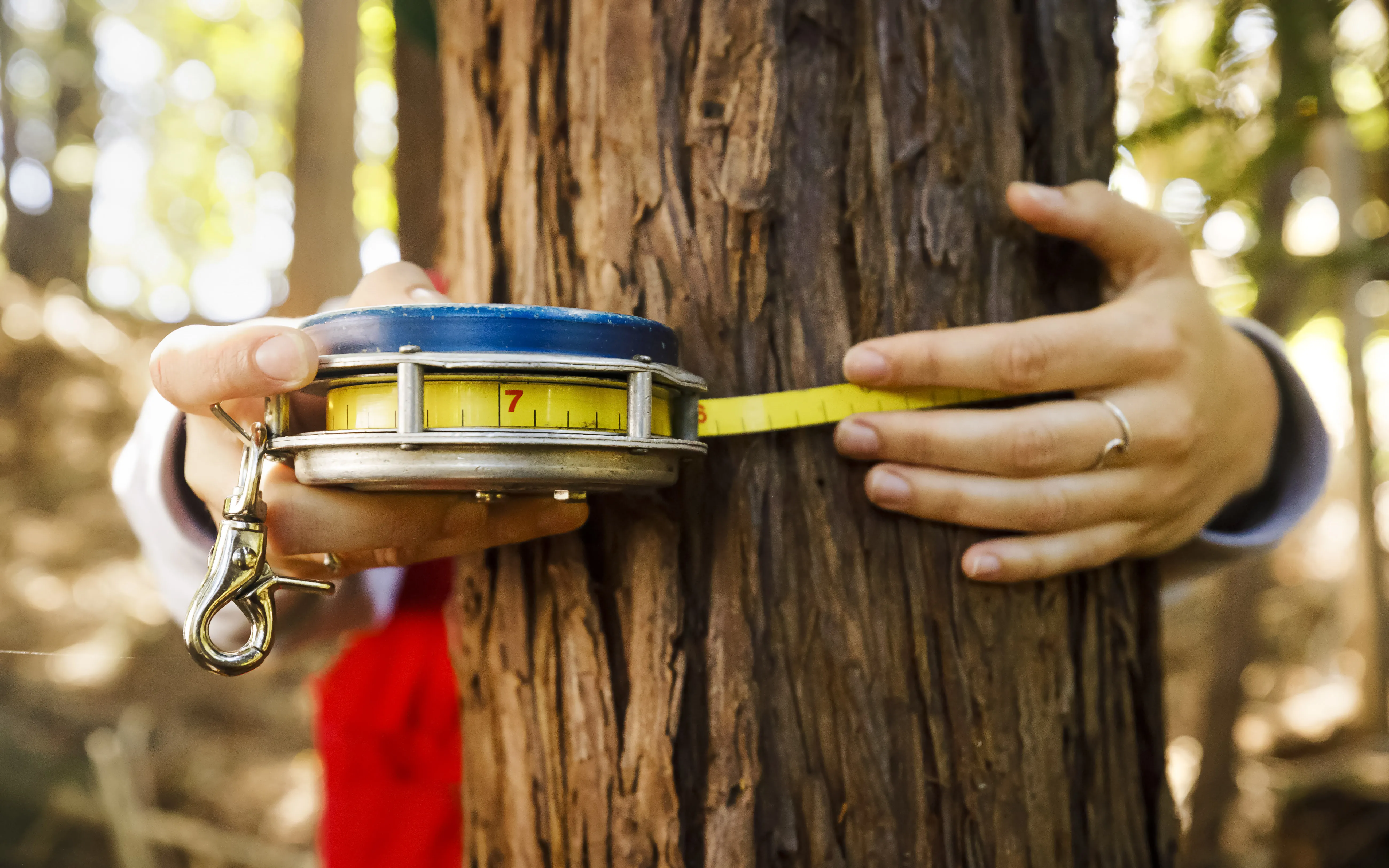 A forestry student measures the circumference of a redwood tree at Cal Poly's Swanton Pacific Ranch.