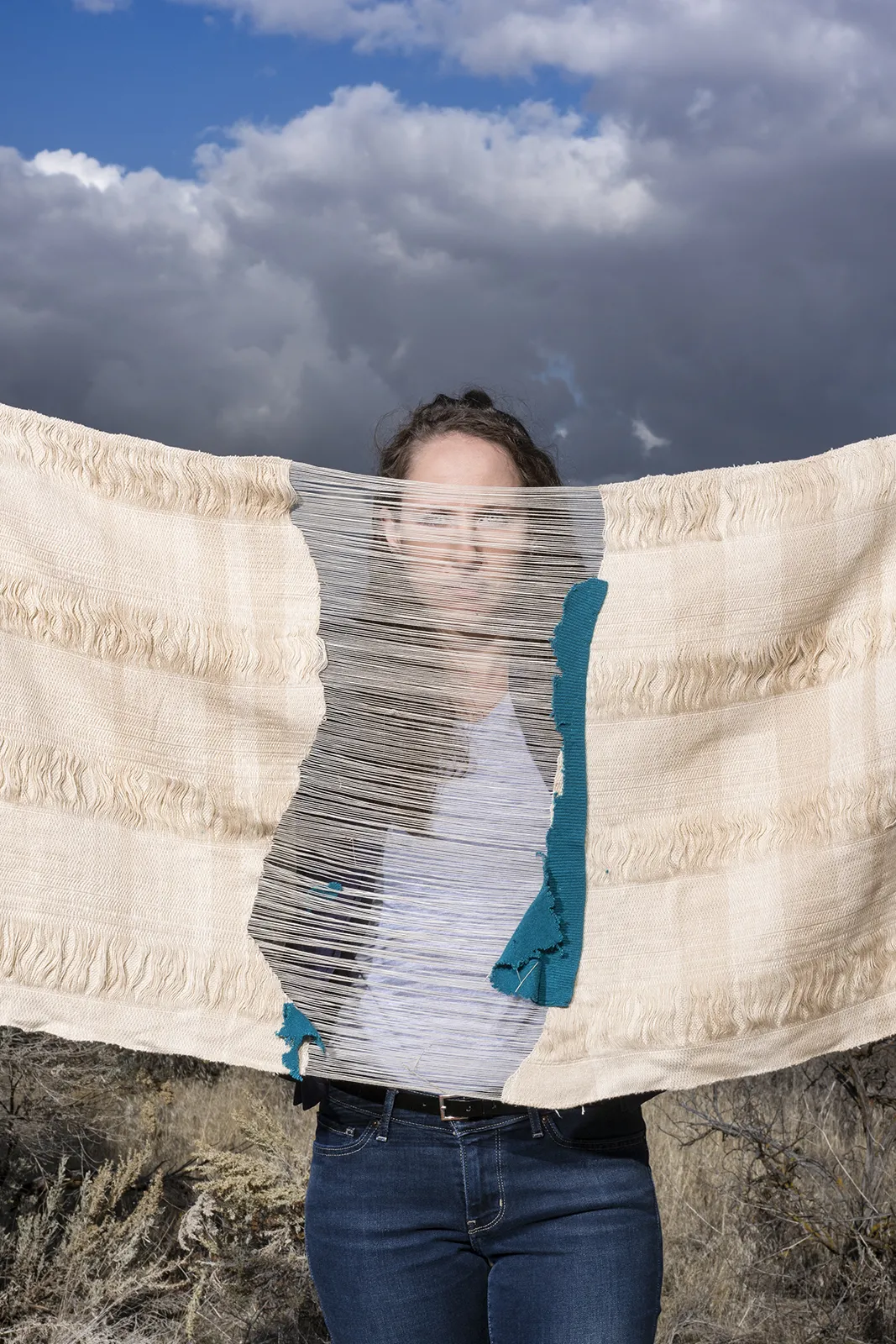 This image was created to accompany a story for our research magazine. The story is about art professor, Lily Lee, who weaves burial shrouds for unidentified female victims of murders that took place across the West for decades. Lee researches victims through the National Missing and Unidentified Persons System and other such databases. She collects data – victims’ height, weight, age, the GPS coordinates of the sites where their bodies were found – and uses a weaving software program, Fiberworks, to translate the numbers into original patterns. The shrouds match the height of the women they memorialize. The density of the weave patterns reflect the state of decomposition of their bodies. The particular shroud Lee is holding in this photo represents a body that was missing their torso.