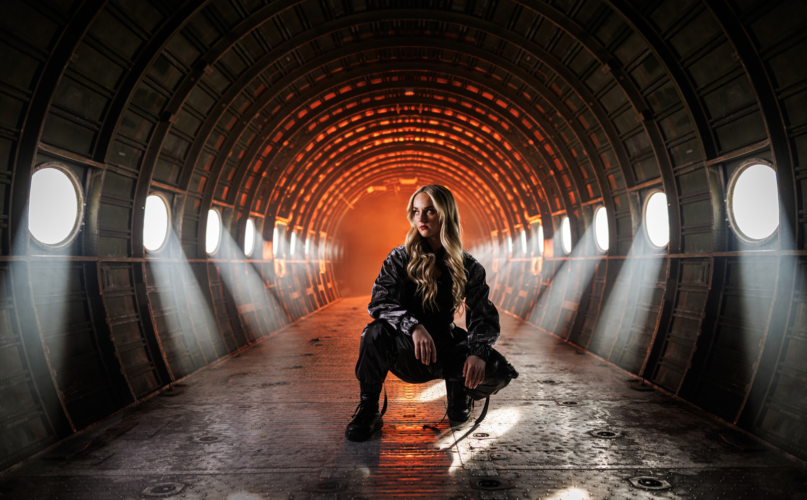 Photoshoot with Dance group the Cougarettes at Historic Wendover Airfield. This image has windows from the airplane composited on opposite side to hide aircraft door opening and to make window light symmetrical.