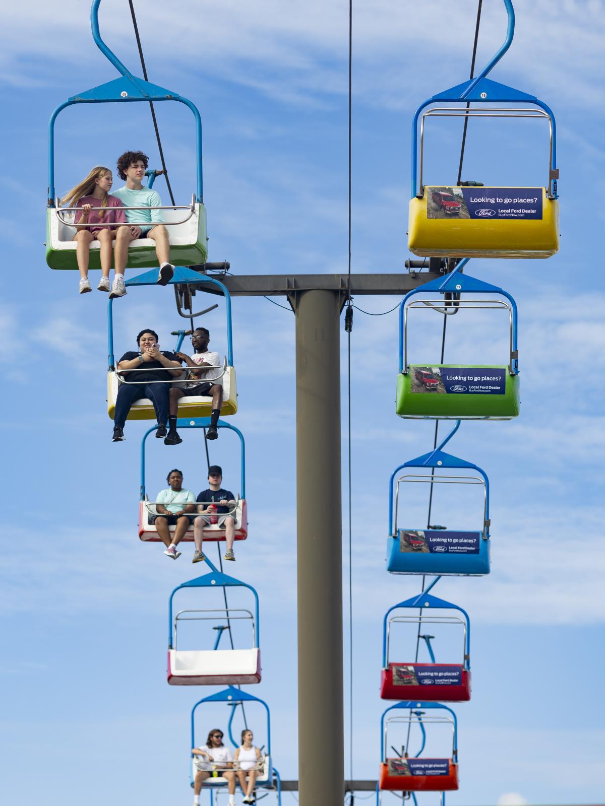 Couples ride the chair lifts across the fairgrounds at the State Fair in Perry, Ga.
