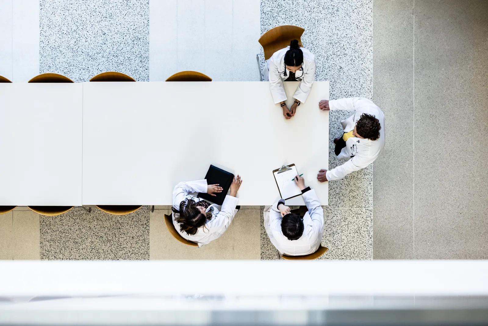 Medical students meet to debrief after completing some simulations.