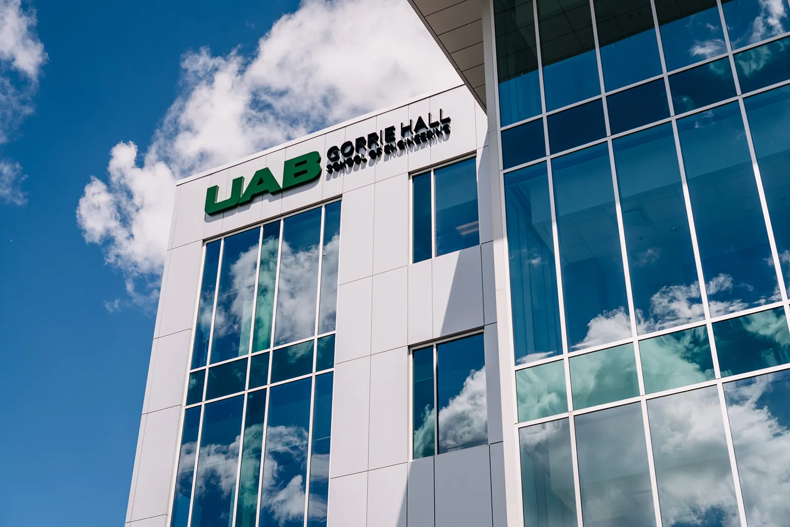 Clouds reflected in the windows of a brand new building, with my university's brand new logo.