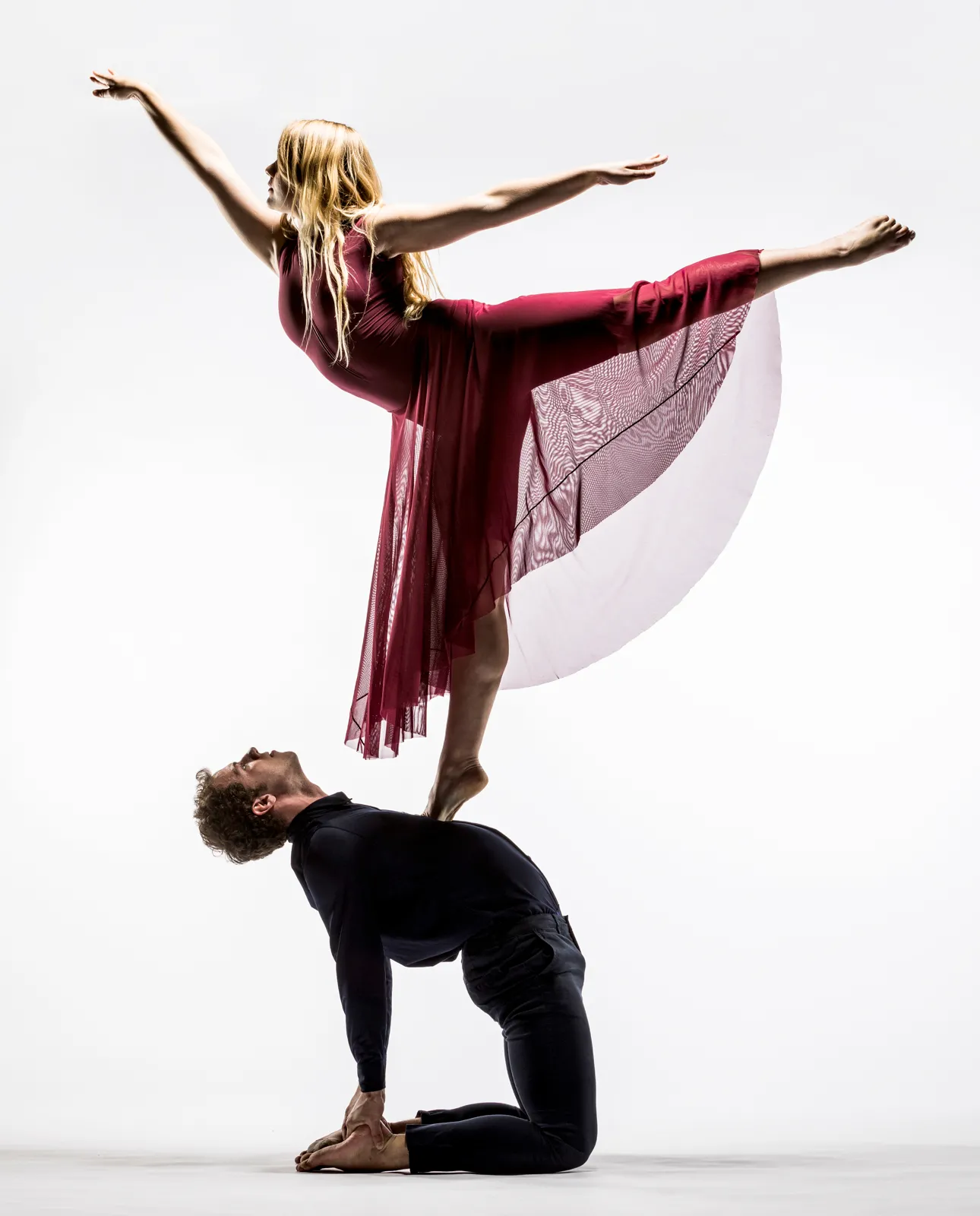 A female dancer balancing on the chest of a male dancer during a photoshoot for Contemporary Dance