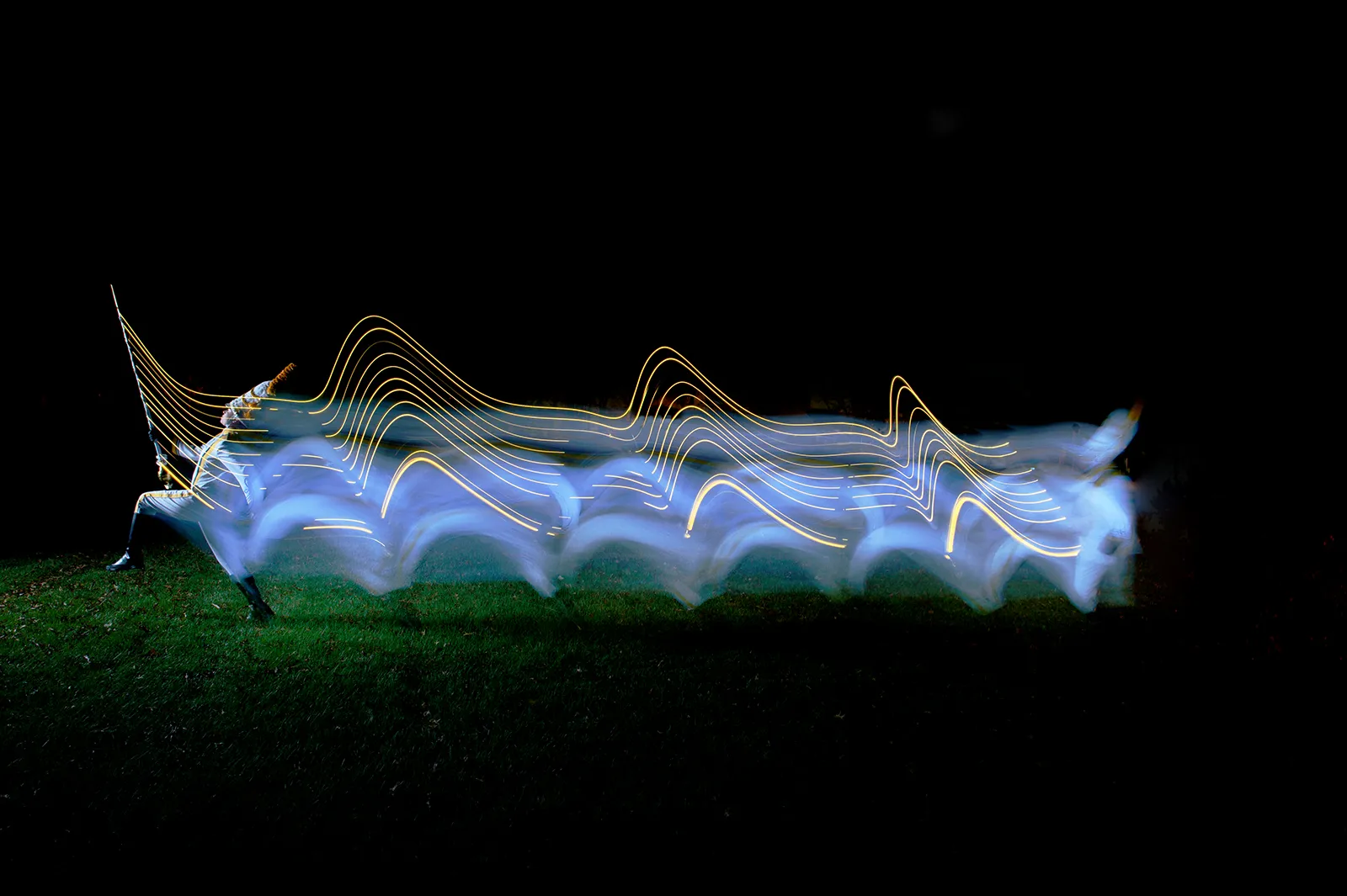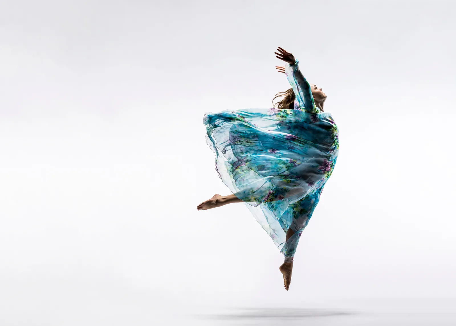 A contemporary dance student jumps with her flowing blue dress, kind of resembling a beta fish...