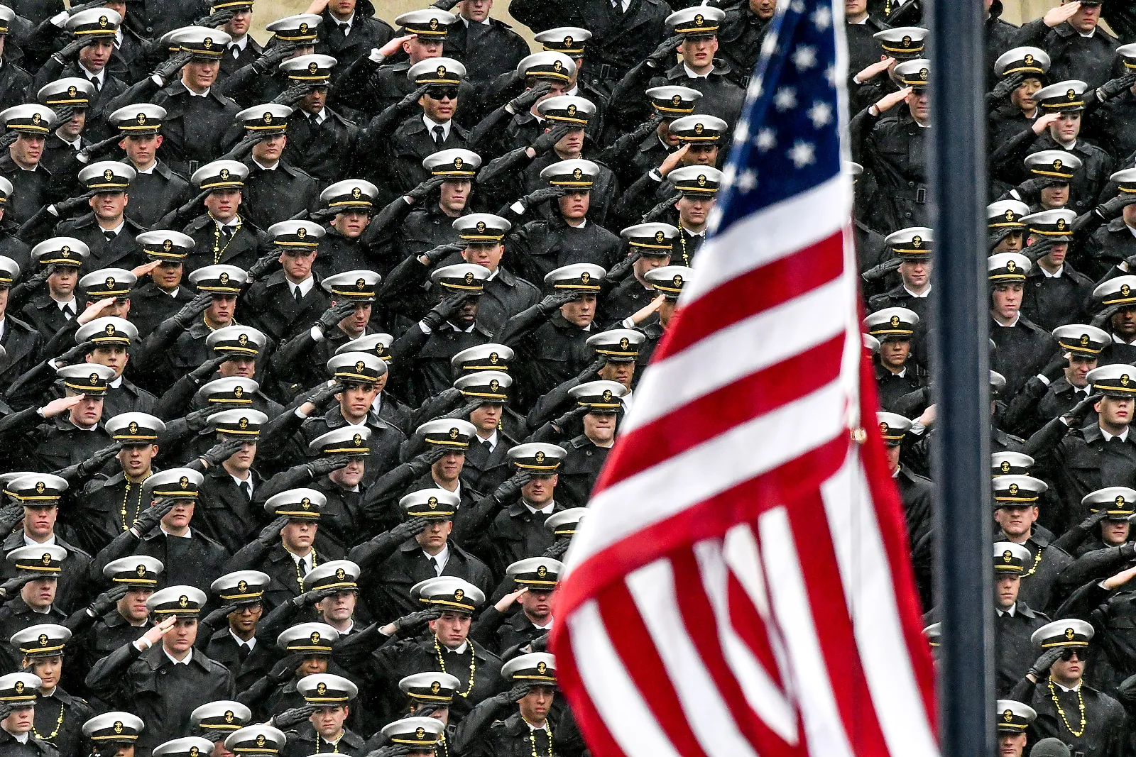 U.S. Naval Academy midshipmen salute as the flag is raised before the game against Navy.