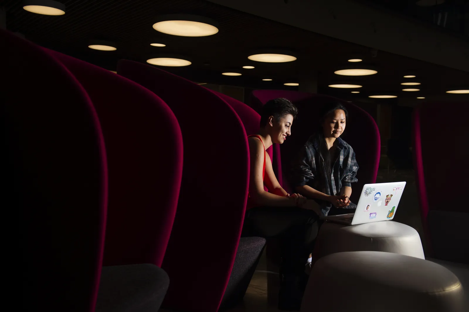 Danielle Nguyen, CIS’19 and Niousha Jafari, CIS’19, of NU Hacks work on a laptop in ISEC on May 9, 2017.