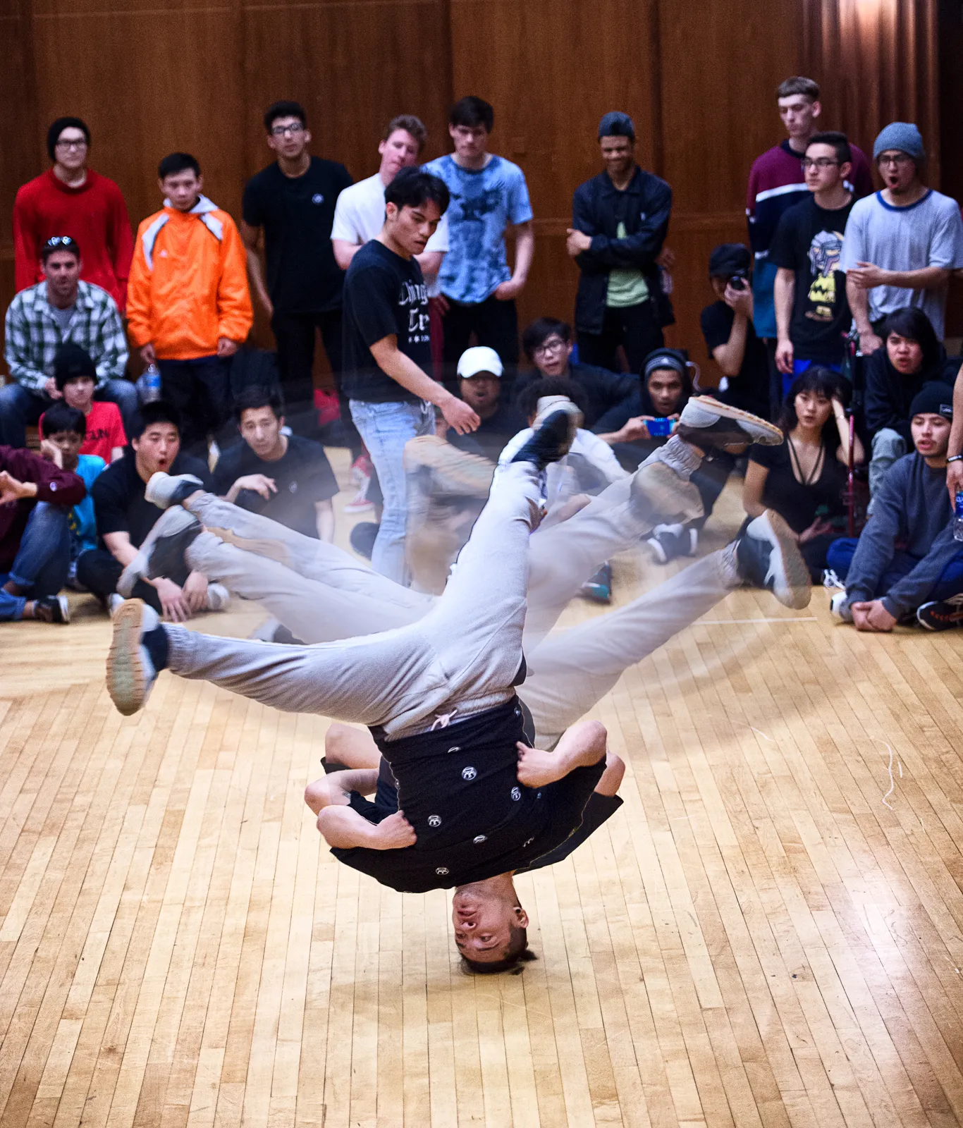 A competitor makes his moves during the UI Breakers "I oughta wreck: ABSOLU7E (Iowa7)" breaking battle at the IMU in April. Photo composite of a multi-frame burst.