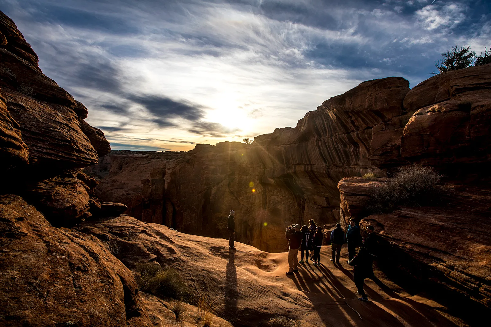 Students and faculty are lead on a tour of red rock canyons near the Four Corners area. The students were learning details of the local geography and culture.