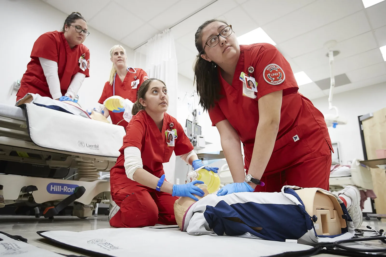 Nursing students practice CPR on mannequins that show the speed and depth of compressions so students can perform CPR properly.
