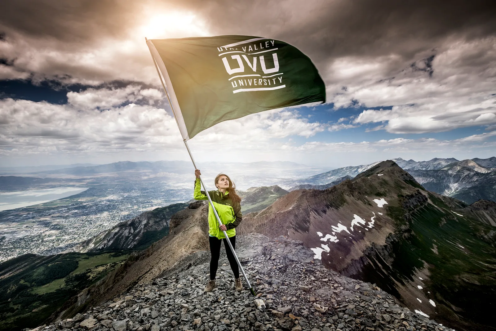 UVU student holding a flag on the top of Mount Timpanogos on the annual Timp hike with the university president.