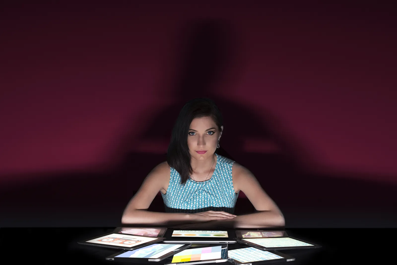 Dancer Katie Peatross looks at her reflection during an underwater marketing shoot for the upcoming dance season.