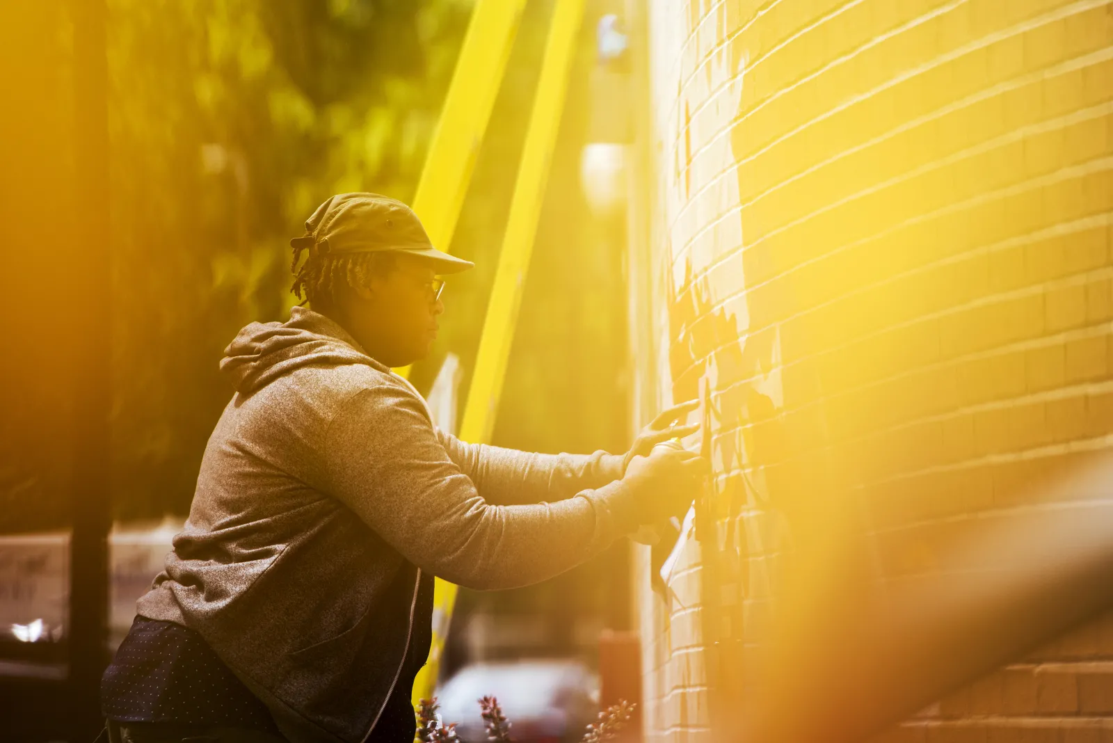 Boston-based artist Cedric Douglas works on a new public art installation on campus, as seen through newly planted yellow tulips.