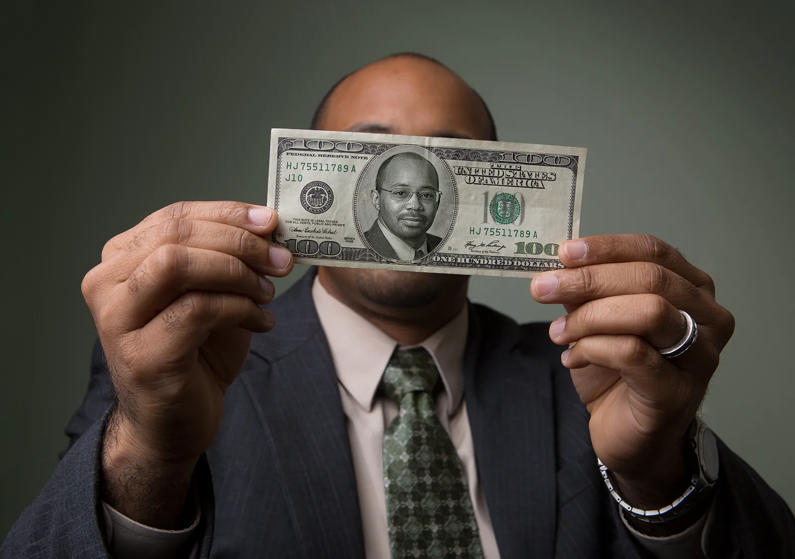 Portrait (illustration) of a financial planning student. Can't see his face? Look closer at the $100.00 bill.