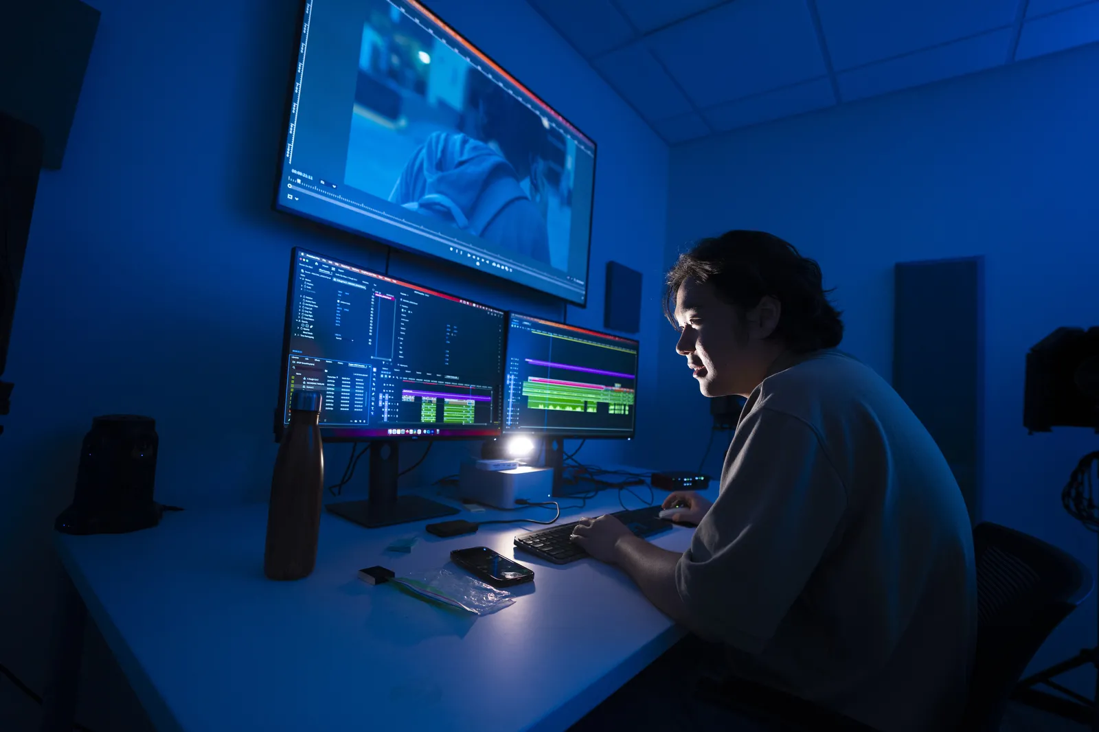 Haneol Lee edits his final project, a Korean movie, for his Immersion class.