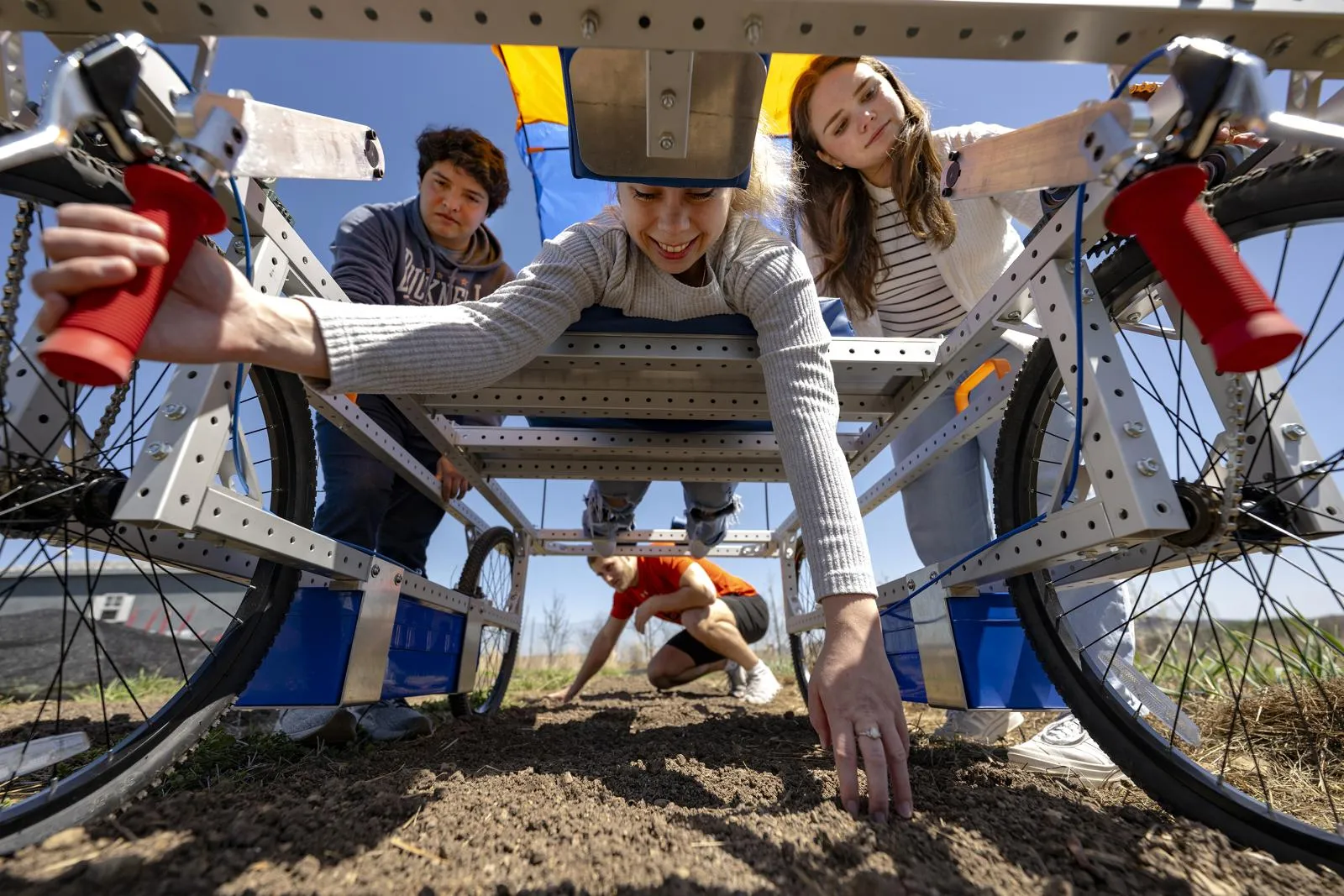 Four students demonstrate and work on the harvester they built to use on the campus farm as part of their engineering senior design project.