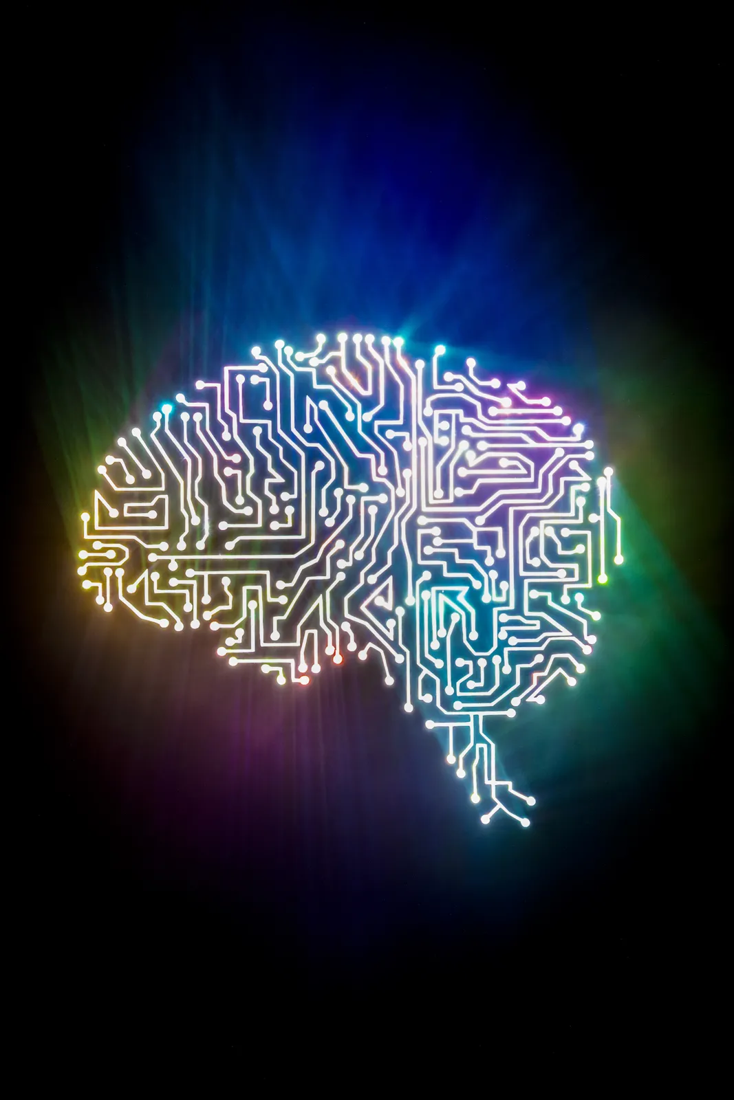 The image is for our psychology department as part of editorial and marketing content for new programs. The brain was created in Illustrator and then cut out using a Cricut printer. A multitude of small lights shining through iridescent film in different directions created the colorful and future driven image. No AI was used to tell a story of AI.